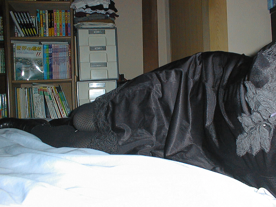 ボツにするか否か迷った写真ですが、面白いので載せました。なんすかね、この生き物は?!という一枚です。 腕の存在を感じさせないことと、身体がすっぽりスリップに覆われていて、胸元から脚まで直線的に窄まっていることから、わたしには蓑虫に見えるんですよ。大きな赤い口と、ぼよよーんな胸もあるので、名前を付けるとしたら、『妖怪・蓑虫女』とか。 蓑虫はミノガという蛾の幼虫。ミノガの雄は羽化して飛び立つそうですが、雌は羽化せず蓑の中で一生を終えるんですって。 わたしも死ぬ直前まで女装続けたいですね。まったりしたペースでいいので。 |