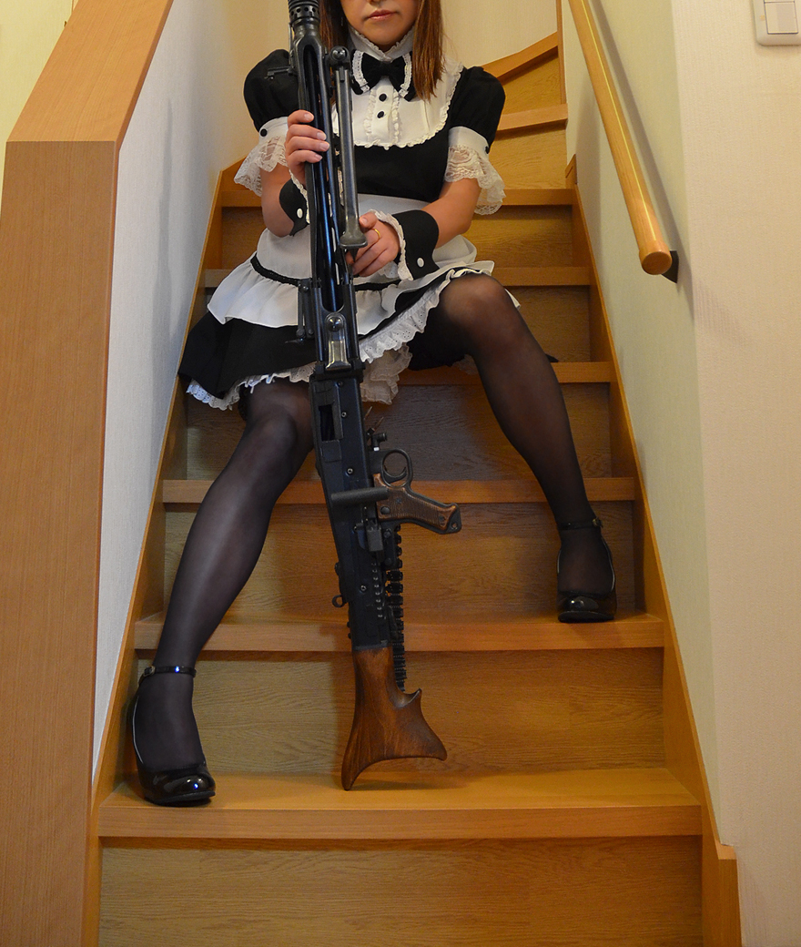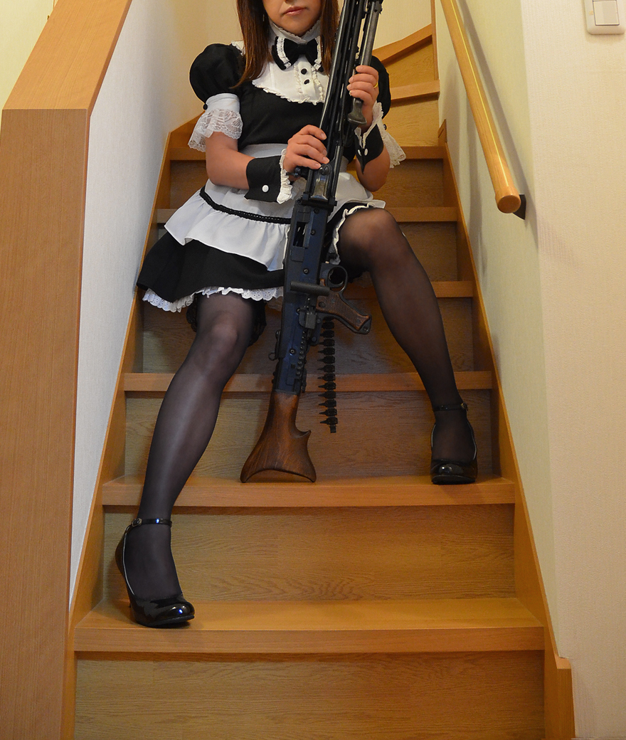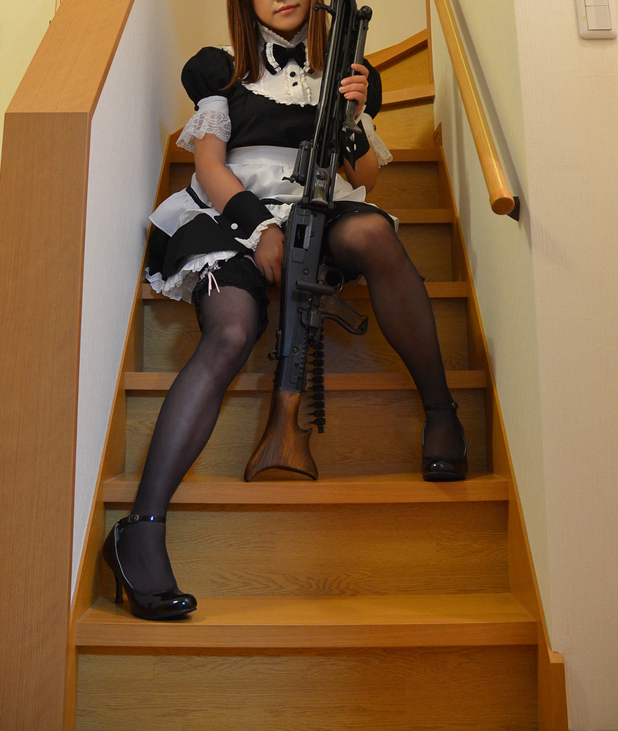 今回の武装メイド撮影の主眼は、MG42を存分に撮りきることでした。 わたしが持っている銃の中で、MG42の存在感は一頭地を抜いています。お値段はもちろんのこと、金属と木材から成る本物らしさや、そのサイズ。圧倒的な威圧感はまさしく別格。 そんな特別なMG42、うちのサイトでは今までに三度掲載してきました。此度のメイドで四回目。ひとつの銃をこれだけの回数撮影したのは、MG42だけです。 でもね、銃の魅力を引き出せたか?わたしが満足する写真が撮れたのか? というと、むむむ〜なのです。 なにせ、過去三回のコンテンツで披露した写真は八枚。一回あたり三枚弱。さすがにこれは少ないのなあ。 ベタ褒めしておきながら扱いは反比例している、みたいな。 強烈な存在感故、それを活かしきる衣装に出会えていなかったということですねえ。 |