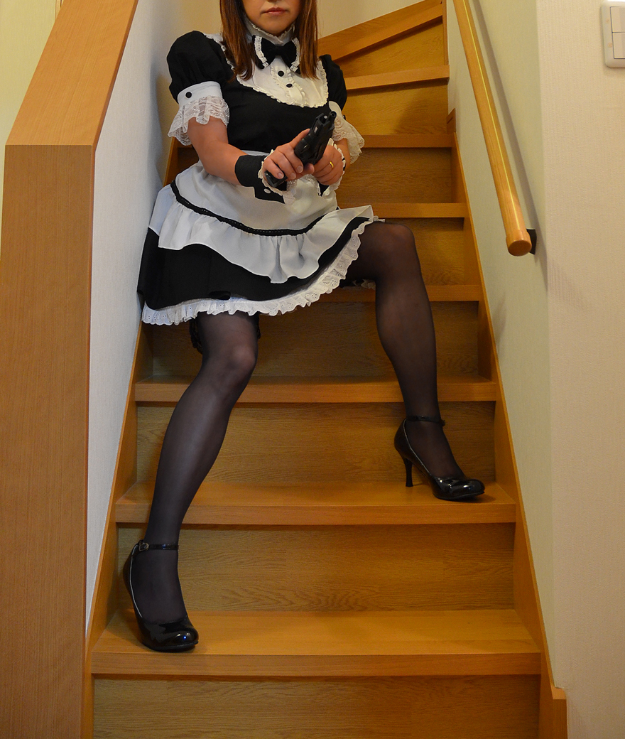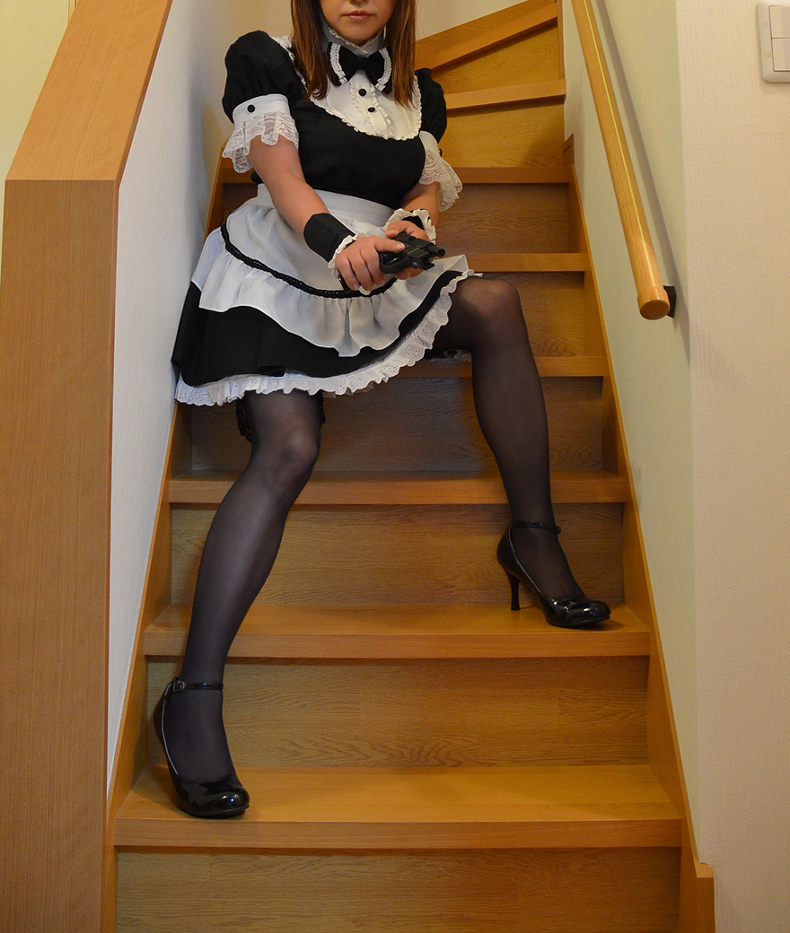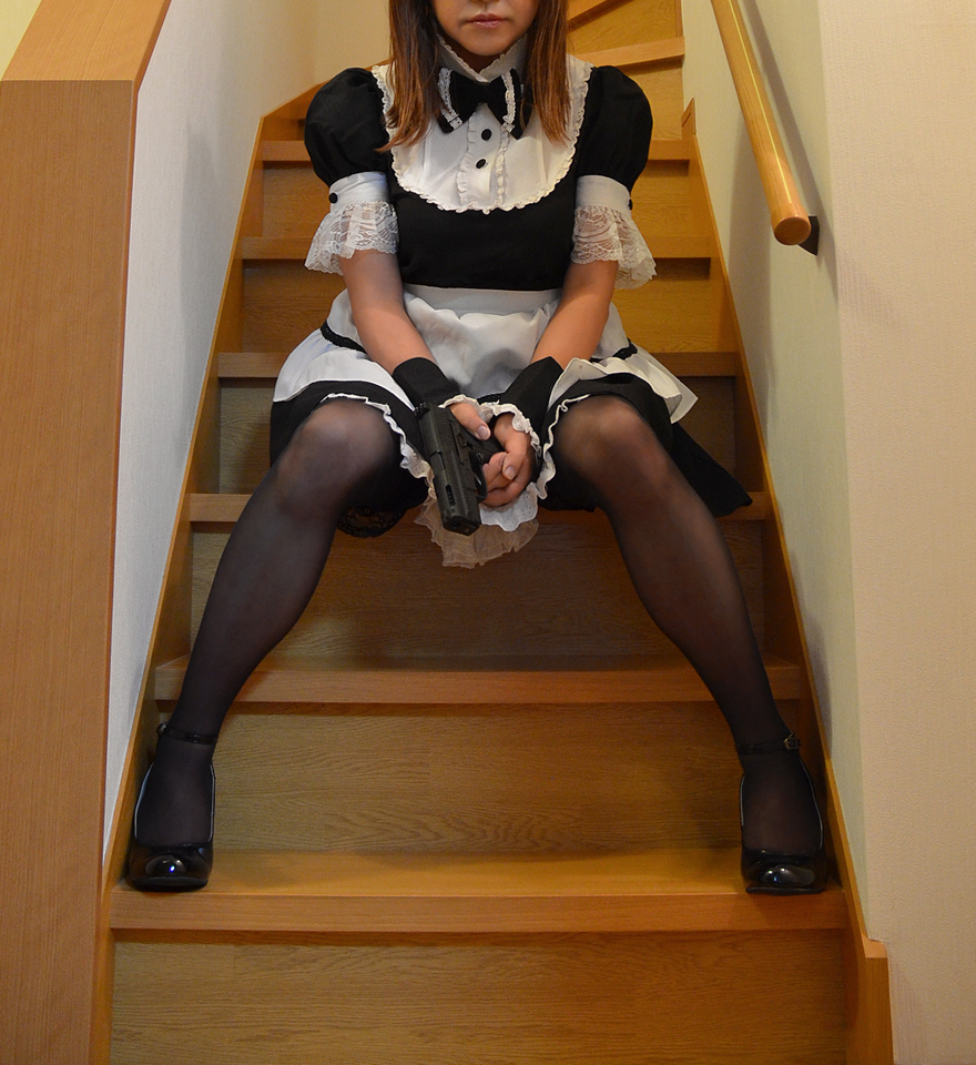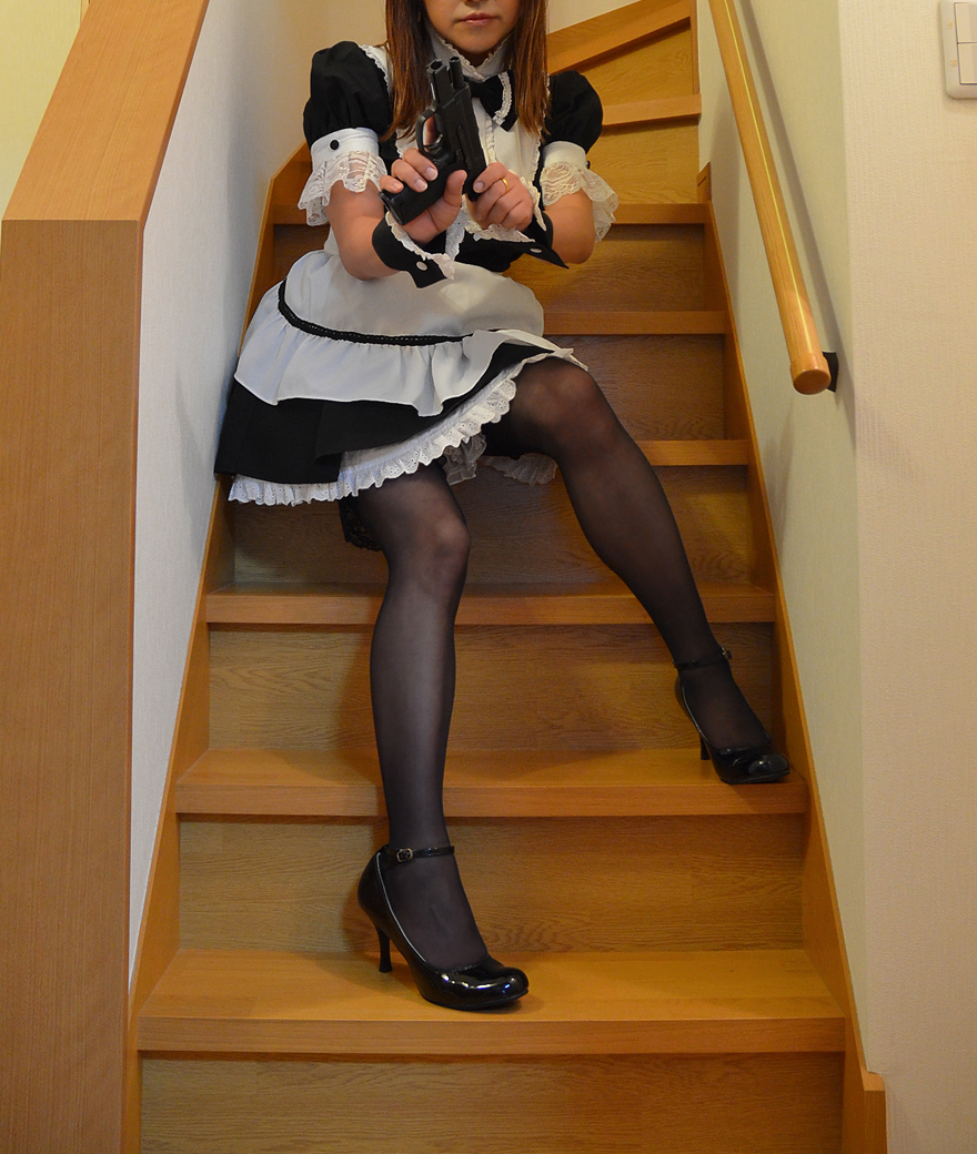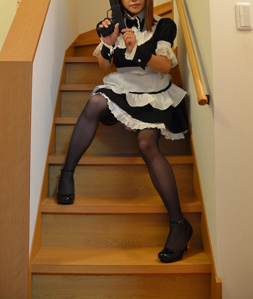 はい、ピストルでも階段。 上半身は何をしているかというと、スライドを引いて、弾倉内の弾を薬室に送り込んでいるところ。 下半身はまあ、わたしの脚を見ろ!という状態です。 階段というのは良くも悪くも脚が強調されますね。太腿から脚先までを延ばすようにするとスラッと感が増す。膝をまげてお尻と脚先の段差を少なくすると、ふくらはぎの太さが強調される、みたいな。 不用意なポーズはボツ写真を増やすもとになります。要注意。 |