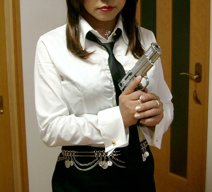 a, d, gは両年とも全く同じものを使っています。 cとfは現物が異なるものの、言葉にしてしまえば同じになってしまう似た者同士。 hは実のところ結構違いがあるものの、パッと見似ているので一緒にしちゃってOK。 これらを合わせれば、8項目中の6つが一致。シャツの色の違いがインパクト大きいので、全然異なるコンテンツに見えがちですが、実はかなり近しい関係にあると言えるんですよ。 特に注目すべきは銃。 上の写真でわたしが持っているのは、スミス&ウェッソン社のM945(を模したKSC社のガスガン)。 一方、リボン襟ブラウス編で得物にしたのは、コルトM1911A1(を模したWA社のガスガン)。 ブラウス編の文中にて、M1911のパテントが失効したことにより、我も我もとM1911のクローンモデルを商品化するようになったと書きました。M945は単なるクローンとは言えないものの、M1911の設計を取り入れた銃であることは事実。 12年の間をおいて意識せず通じるところの多い写真を撮影し、新作のテキスト考案中に旧作の存在を予言するような言葉を思いつき、新作のHTMLファイル編集中に旧作に再会した....。 ね、やっぱ面白いでしょ。 |